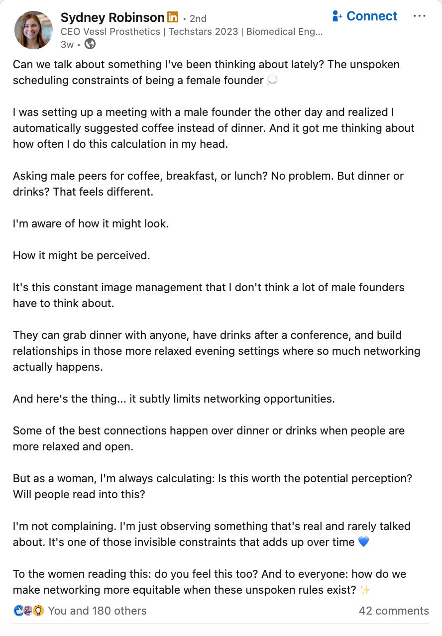 But if we’re serious about understanding why access to capital remains unequal, it requires looking beyond the surface-level advice and acknowledging the less visible dynamics that shape how that advice plays out in practice.
